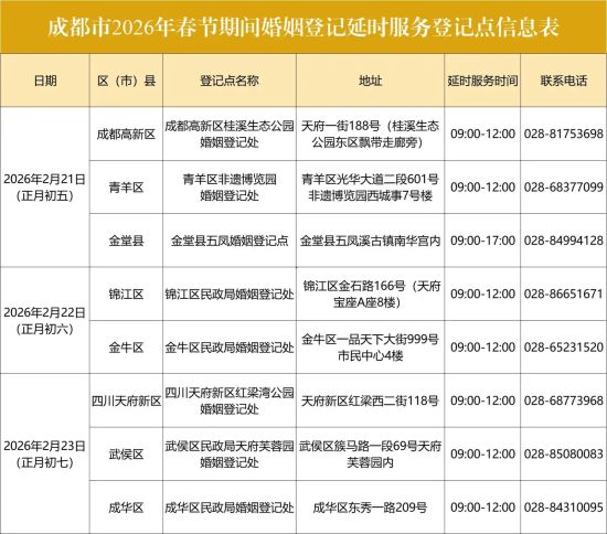 2月4日,川观新闻记者从成都市民政局获悉,为满足新人在新春佳节期间办理婚姻登记的需求,成都市部分婚姻登记处将于2026年春节假期提供延时服务(详见下表)。