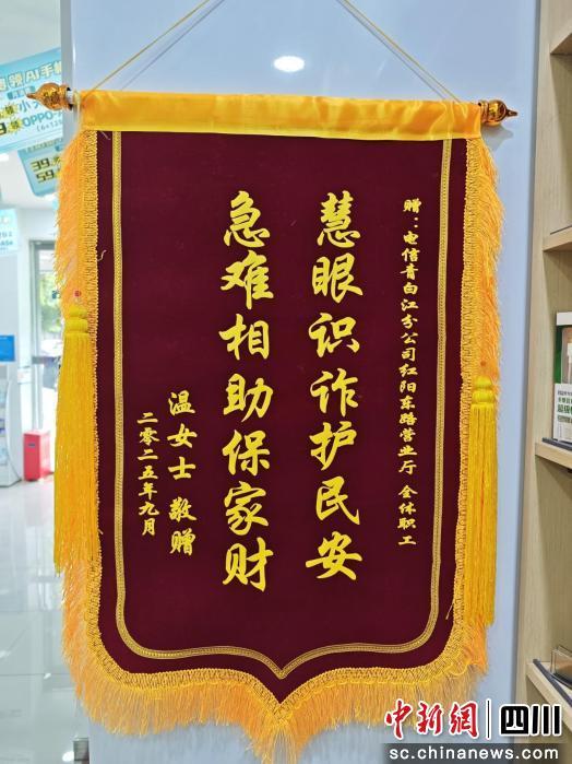 事后,温女士专程向营业厅赠送锦旗表示感谢。青白江区反诈中心对中国电信青白江分公司的快速响应和专业处置给予肯定,并将该案例用于反诈宣传。