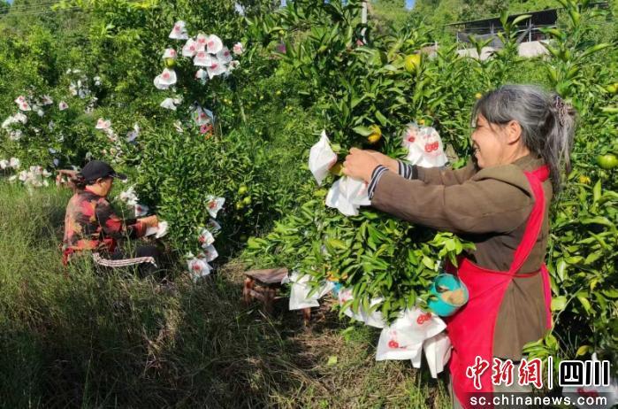中新网四川新闻10月14日电(吴平华 张凤莉)近日,秋日的阳光洒满山野,资阳市乐至县龙门镇农科村的千亩柑橘基地里,果香四溢,一片忙碌。据悉,从10月7日开始,近百名村民齐上阵,为“春见”柑橘套上特制的白色果袋。这场持续一个多月的套袋行动,看似简单,却是柑橘品质的“守护神”。