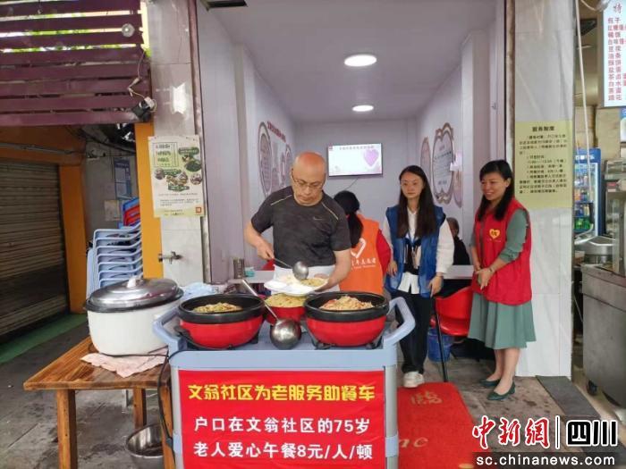 文翁社区居委会主任孙玉凤介绍,这一助餐点采用“社区合伙人”模式运营。社区通过前期走访辖区餐饮商家,最终与“马蹄花川菜馆”达成合作。餐馆老板马涌主动出资装修场地、购置餐车与餐具,共享厨房与人力,以成本价8元/餐的标准,每日提供50份爱心午餐。