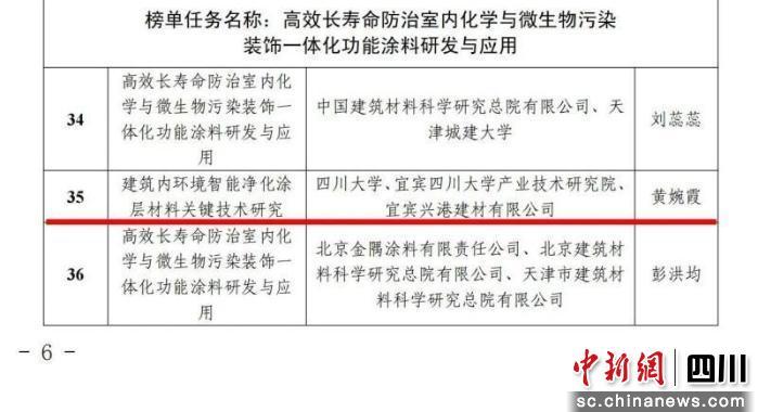 中新网四川新闻12月14日电(吴平华 刘书堂)近日,中国建筑材料联合会与住房和城乡建设部科技与产业化发展中心联合公布首批“好材料适配好房子”科技攻关“揭榜挂帅”项目榜单,由三江集团港建公司兴港建材和四川大学、宜宾四川大学产业技术研究院协同攻关的“建筑内环境智能净化涂层材料关键技术研究”项目,经严格评审脱颖而出,成功入选国家级科技攻关榜单。这标志着该联合团队在绿色建筑功能材料领域的技术创新实力获得国家级权威认可,也为国内室内环境健康提升与建材产业升级注入强劲动力。
