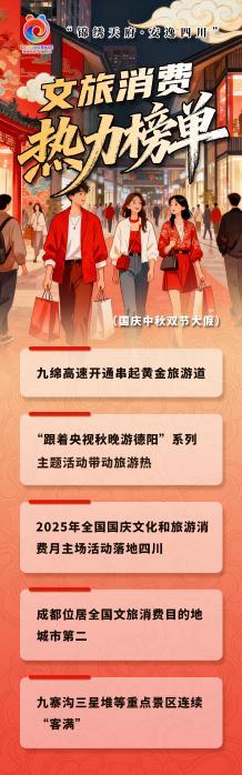 近日,川观智库文旅研究院联合四川大学旅游学院发布“锦绣天府·安逸四川”文旅消费三大主题热力榜单,聚焦国庆中秋双节大假消费、演艺赛事消费、冬季旅游消费三大核心场景,展现四川深度推进“文旅+百业”“百业+文旅”的生动实践和蓬勃活力。