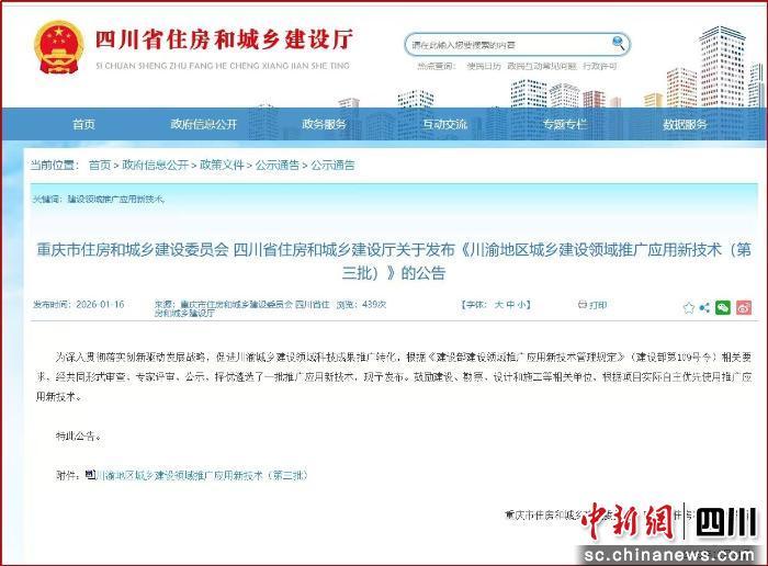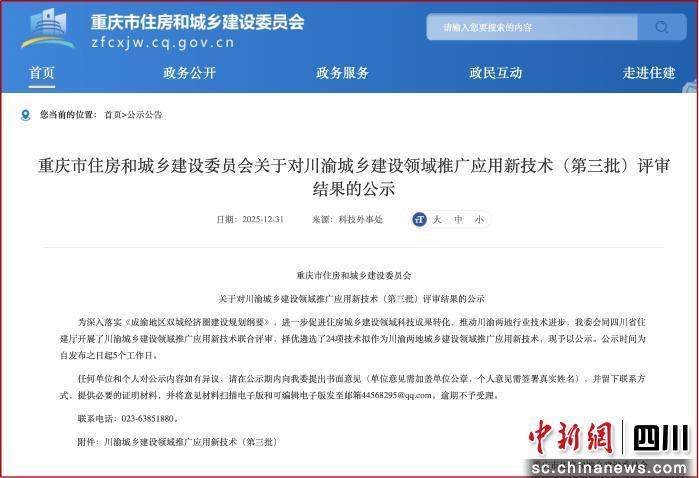 中新网四川新闻1月21日电 近日,重庆市住房和城乡建设委员会与四川省住房和城乡建设厅联合印发《川渝城乡建设领域推广应用新技术(第三批)》,共有24项新技术入选,覆盖智能建造、绿色低碳、韧性城市建设等多个前沿方向,为成渝地区双城经济圈高质量发展注入新动能。