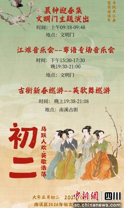 正月初三(2026年2月19日)9时18分-9时48分,在文明门举行晨钟迎春主题演出;15时30分-17时30分举行江滩音乐会一一假面摇滚音乐会;19时38分-21时08分在南溪古街举行古街新春巡游一一动漫杂耍巡游。