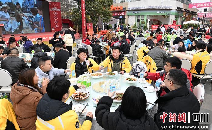 中新网四川新闻2月10日电 近日,在成都市大邑县滨江新城广场上,浓浓暖意在人群中汇聚流淌。这天中午,环卫工人、外卖配送员、网约车司机、货车司机等100多名新就业群体欢聚一堂,围坐在一起吃了一顿热气腾腾的团年饭。