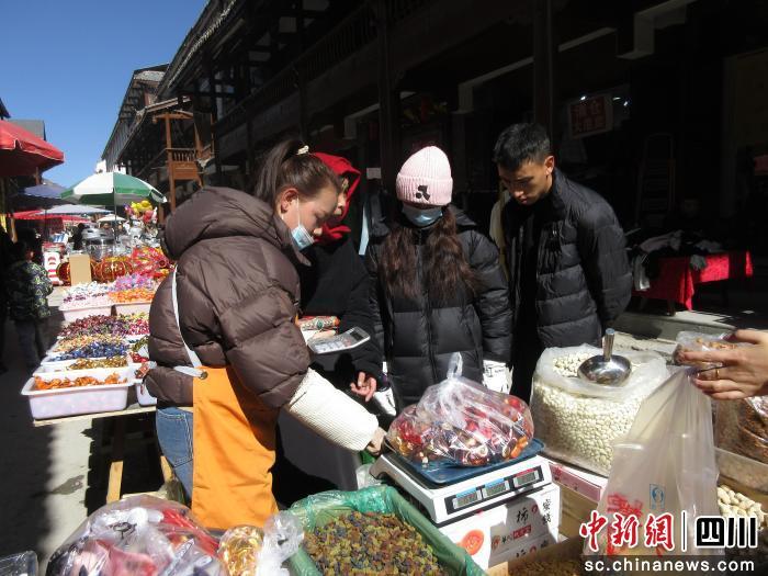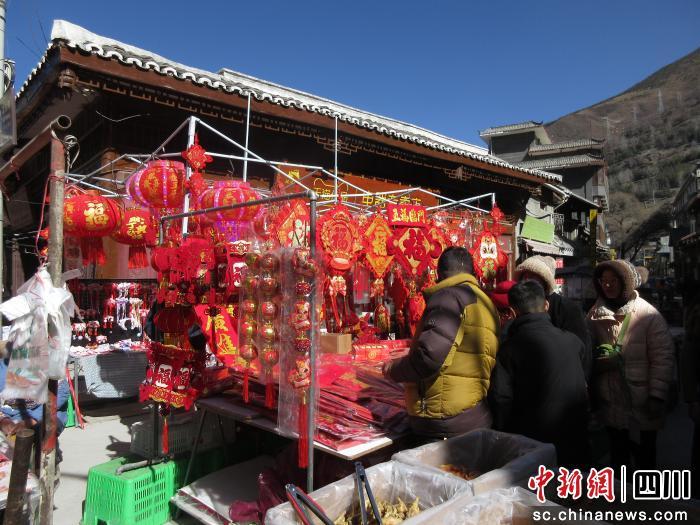 中新网四川新闻2月11日电 (张成亮)丙午马年春节即将到来之际,千年松潘古城张灯结彩、暖意融融,以街为市的年货市集人头攒动,大红灯笼沿街高挂,特色美食琳琅满目。藏、羌、回、汉各族民众与八方游客欢聚一堂,处处洋溢着其乐融融、喜气洋洋的节日氛围。