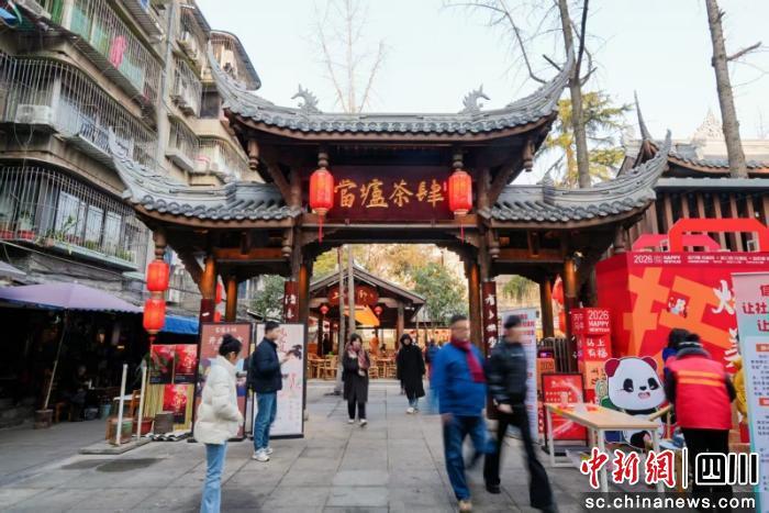 11日,不论是对夜市颇为熟悉的老茶客,还是经常打卡的好吃嘴,都注意到夜市入口处的露天茶园变成了带着川西民居建筑风情的当垆茶肆,白天一把竹椅、一杯盖碗茶,散发着成都独有的悠闲气息;夜晚一方戏台,将抚琴街巷根植的汉代风韵尽情展示,一部舞剧、一部话剧,合奏出抚琴最深厚的文化基因----《凤求凰》;一杯川茶、一杯蜀酒,尽是抚琴街巷历史与温情。当天,当垆茶肆前举行了“琴韵传情贺新春·茶肆寻味话团圆”为主题的2026年迎春活动,通过经典剧目、精美舞台、传统民俗等多元形式,让居民在沉浸式体验中感受新春喜乐。