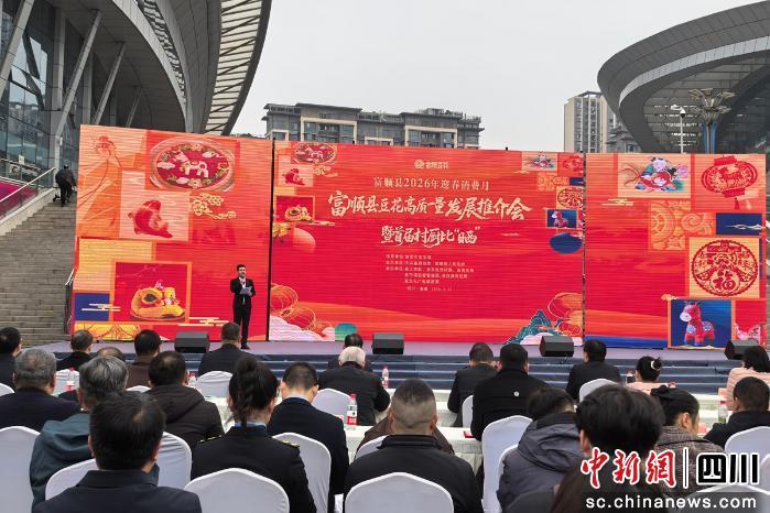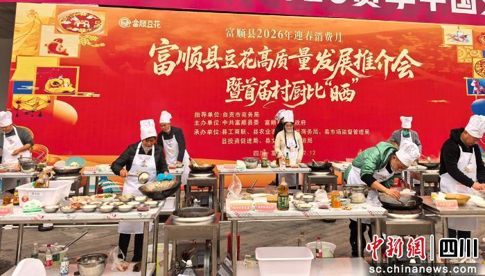2月12日,自贡市富顺县文体中心人头攒动、鼓乐喧天,富顺县豆花高质量发展推介会暨首届村厨比“晒”活动在此进行。同时,旁边的2026年“非遗好物 国潮焕新—非遗年货购物月”摊位同样人气爆棚,各式好物琳琅满目,为市民游客献上一场兼具烟火气与文化味的新春盛宴。