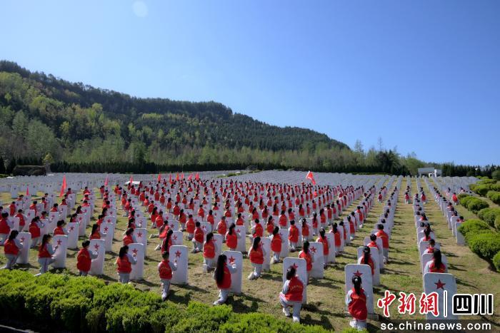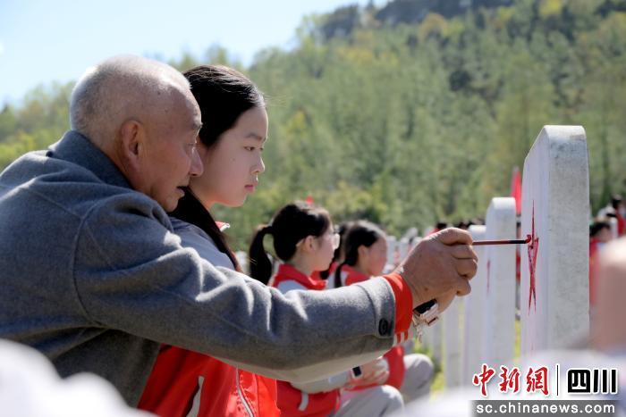 中新网四川新闻3月27日电 (胡鹏 周树江)3月26日,清明节将至,坐落于四川省巴中市通江县的川陕革命根据地红军烈士陵园内,松柏凝翠、庄严肃穆。陵园散葬墓区,74岁守墓人王建刚缓缓蹲下身,用那双布满老茧、常年打理陵园的粗糙双手,轻轻扶住身边学生的小手,两人一起握紧毛笔、蘸取鲜红油漆,认真细致地为墓碑上的五角星描红。