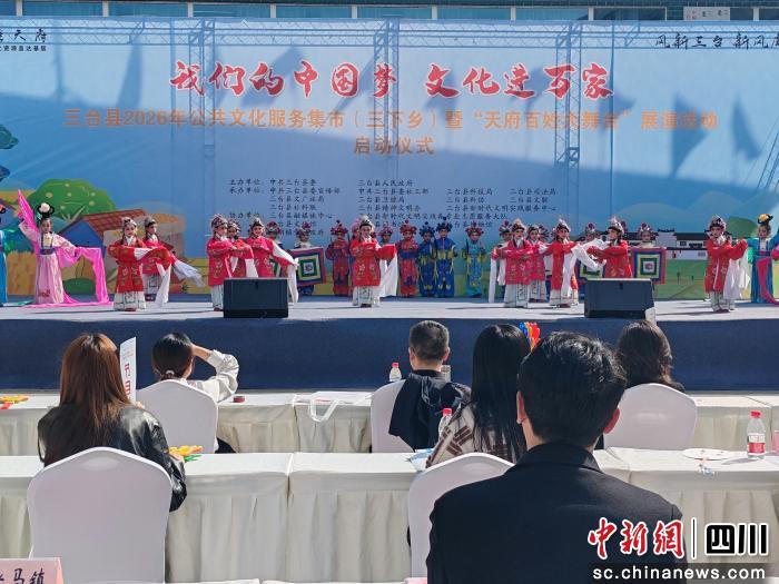 中新网四川新闻4月1日电 (刘玉明)春风拂面,鼓乐喧天。4月1日,绵阳市三台县北坝镇东涪社区文化广场热闹非凡,“我们的中国梦——文化进万家”三台县2026年公共文化服务集市(三下乡)暨“天府百姓大舞台”展演活动在此正式启动。作为三台县首场公共文化服务集市,这场开在“家门口”的文化盛宴,吸引了众多社区居民前来“赶集”。