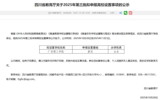 10月28日,四川省教育厅官网发布《关于2025年第三批拟申报高校设置事项的公示》,拟新设置公办高校广安理工学院。