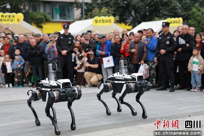 活动开场,2只警犬依次完成坐卧跳跃、搜爆演示等技能展示,紧随其后的机器狗则踩着音乐节拍扭动身躯,引得现场掌声、欢呼声不断。“妈妈快看,那只狗好厉害,一下子就跳起来了。”一位小朋友拉着妈妈的手,眼睛紧紧盯着警犬,兴奋地喊道。