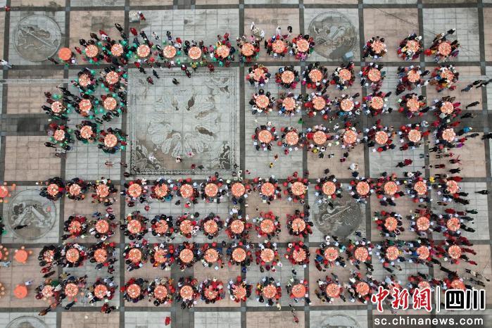 在景区八仙广场,摆放容纳千余人座位的圆桌,更是增添了节日气氛。大家齐聚一堂,一边观看着川剧变脸、美猴王、小魔术等本地民俗节目,一边吃着坝坝宴品尝舌尖上的美味,共话美好未来。