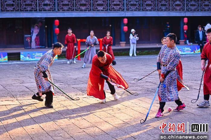 小组赛上,16支队伍在赛场上展开激烈角逐。参赛队员身着唐式圆领袍,手持由四川本地竹编工艺融合蜀锦制作的月杖,为让竹编球攻入对方球门展开智慧博弈。这项既考验个人灵敏反应,更彰显团队默契协作的运动,充分展现了成都职工昂扬向上的精神面貌。