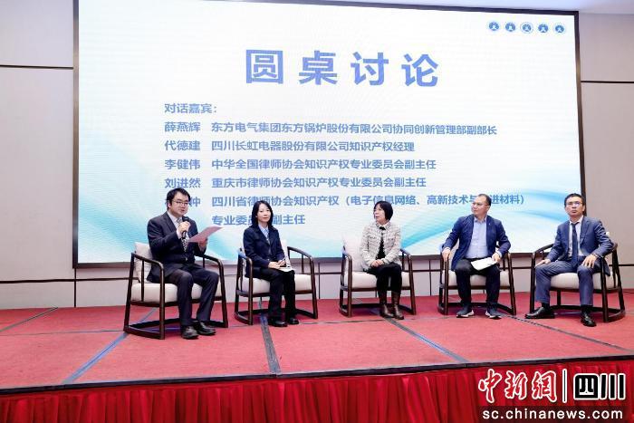 圆桌讨论环节,东方电气集团东方锅炉股份有限公司协同创新管理部副部长薛燕辉、四川长虹电器股份有限公司知识产权经理代德建、全国律协知专委副主任李健伟、重庆律协知专委副主任刘进然、四川律协知专委副主任杜诗仲围绕企业知识产权管理面临的新挑战、提升知识产权法律服务的价值、知识产权法律服务的区域协调发展等问题进行了交流讨论。