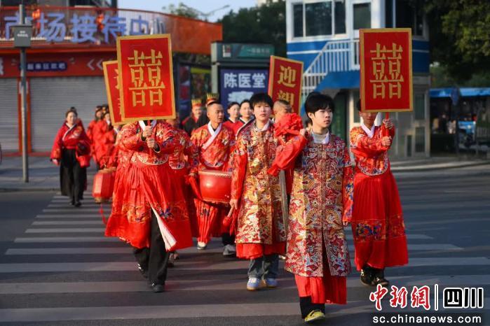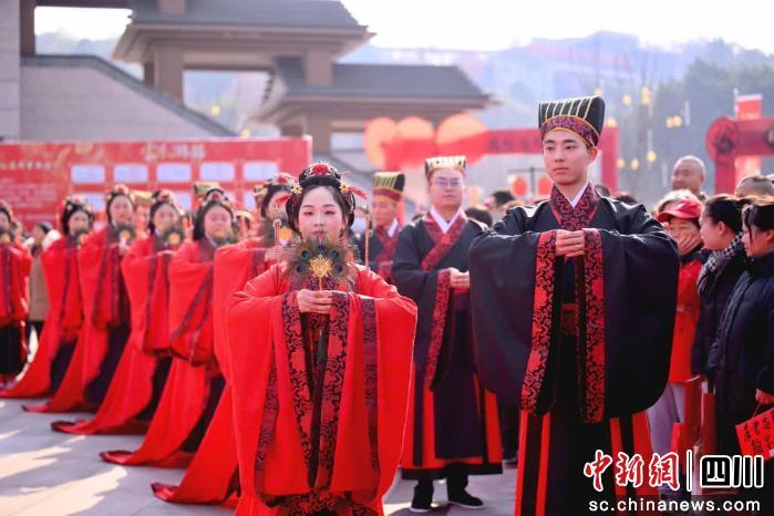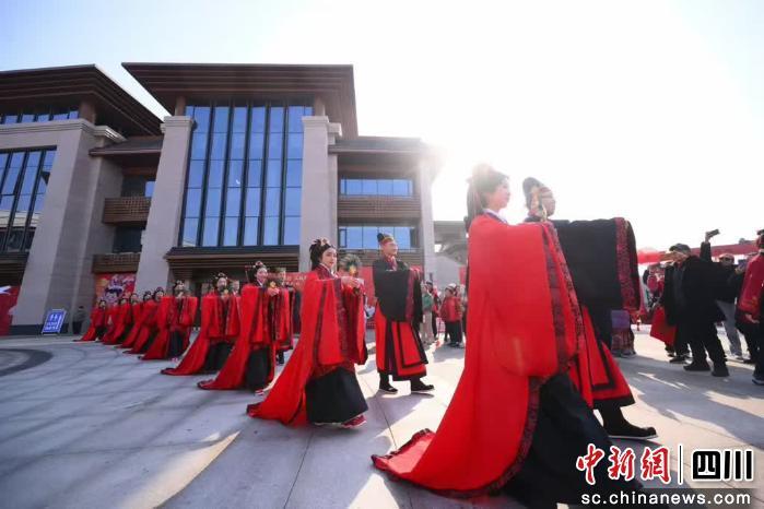 中新网四川新闻2月13日电 (李静洁 李洋 肖鹏)2月12日,绵阳市游仙区开展“富乐游囍”婚恋礼遇行动启动仪式暨芙蓉汉城汉式集体婚礼活动。10对新人身着典雅汉服,在古礼浸润与众人的祝福中,许下相守一生的真挚诺言,携手开启婚姻生活的美好篇章。