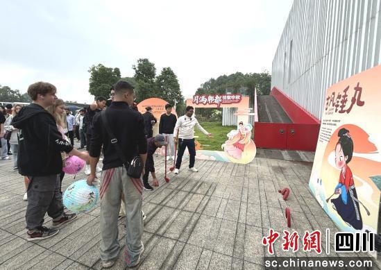 中秋主题合影区前,相机快门声此起彼伏。外籍友人们或手持玉兔灯笼,或站在“‘月’满郫都,情聚中秋”背景板前,用镜头定格与中国传统节日的初次邂逅。传统捶丸游戏体验区更显热闹,有人挥杆落空后笑着重来,有人成功击球后与同伴击掌庆祝:“这简直是古代版高尔夫!能感受到中国人在运动里藏着的智慧。”