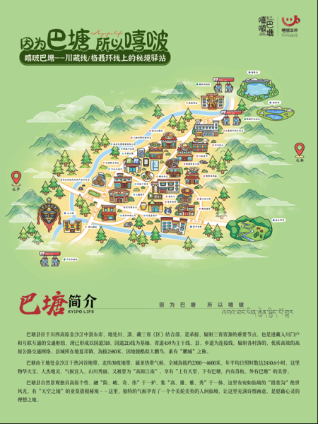 巴塘位于川、滇、藏三省结合部,金沙江中游东岸,是出川进藏的重要门户。这里地处北纬30°地带,属金沙江干热河谷气候,年均日照超2450小时,全域海拔2300至4600米,气候宜人,风景优美,物产丰饶。不仅拥有措普沟、亚莫措根、姊妹湖等自然景观,还孕育了甲着小麦、巴塘中蜂、南区辣椒、苹果、藏香猪、青稞、核桃等优质农特产品。作为弦子之乡,非物质文化遗产底蕴深厚,风景、人文、物产在此交汇,编织出一幅独特的城市画卷。