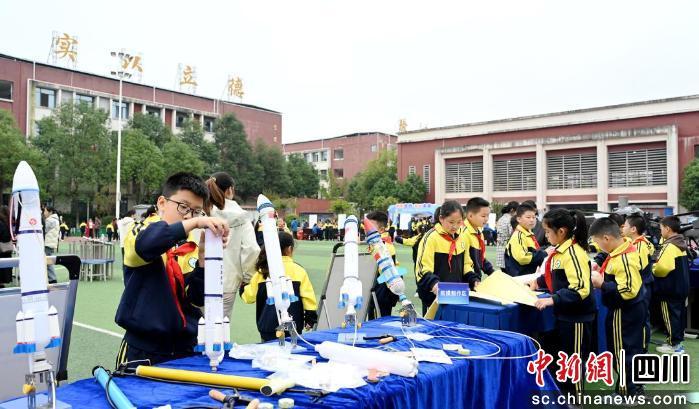 开幕式后,遍布校园的展示区成为师生与家长的“打卡地”。党建广场上,南充科技馆打造的科普实验集市热闹非凡,8至10个科普摊位前,造纸术、蚕丝扇制作、扎染、水火箭制作等互动实验吸引了大批学生参与,科普知识问答环节更是气氛热烈。