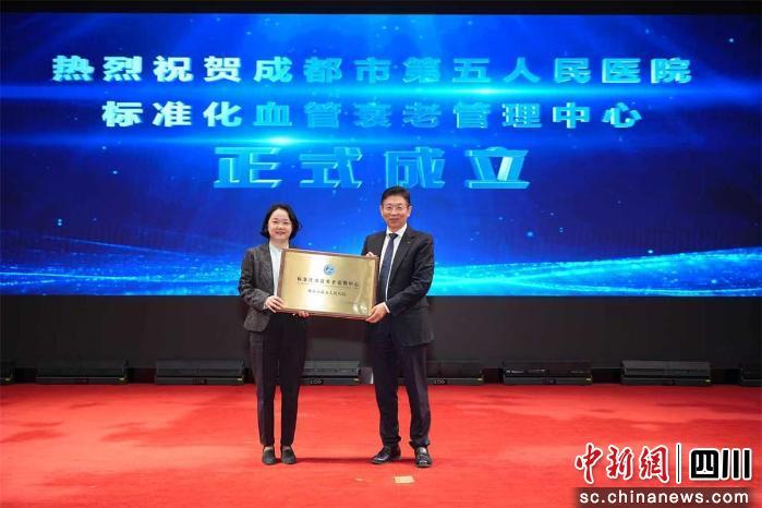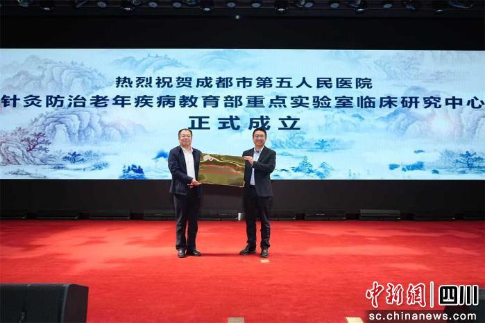在与会领导、专家及代表的共同见证下,成都市第五人民医院正式为“针灸防治老年疾病教育部重点实验室临床研究中心”与“标准化血管衰老管理中心”授牌揭牌。