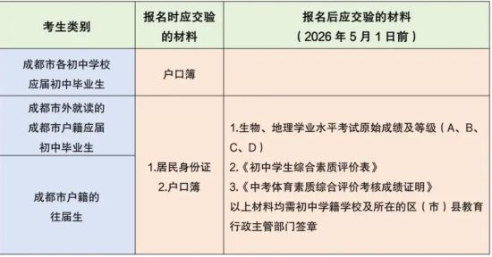 补报名:2026年3月13—16日,因各种原因错过正式报名的考生补报名。学籍、户籍不在同一招生区域的成都市户籍考生可修改之前选择的升学区域。3月13—23日,补报名考生完成《初中学生综合素质评价表》填报。