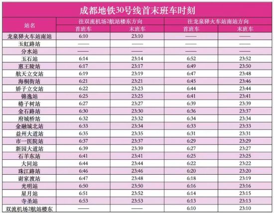 30号线一期采用双流机场2航站楼东站至龙泉驿火车站南站单一交路运营,列车单程运行时间约46分钟。双流机场2航站楼东站首班车时间为6:10,末班车时间为23:10;龙泉驿火车站南站首班车时间为6:10,末班车时间为23:10。