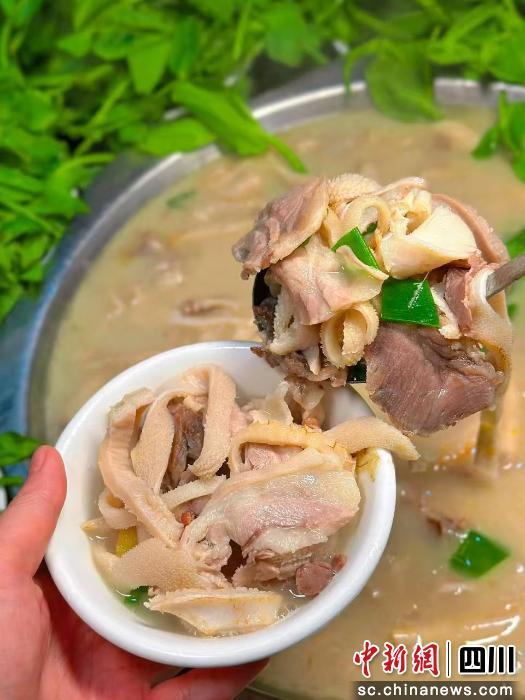 仙山麻羊是葛仙山镇井泉村的“拳头产品”。“这是有‘背景’的羊。喝山泉水、吃百草长大,肉质本身就鲜美细嫩,脂肪和胆固醇含量少,但蛋白质和微量元素丰富。当地人说‘冬至一碗羊肉汤,一个冬天都不冷’,讲的就是它。”井泉村第一书记汪锋推介道。连续三年举办的“冬享暖羊”养生购山货带火了井泉村,八方游客纷至沓来品羊肉汤、尝烤全羊。作为仙山麻羊的主产地,井泉村也走出了一条乡村振兴“羊”光大道,集体经济收入实现较大提升。今年,井泉村集体经济合作社与彭州当地国企成都湔江医教健康服务有限公司合作开发“二十四方·仙山药膳礼盒”,进一步延伸了仙山羊肉汤的客户半径——通过“仙山优品”小程序购买,不到葛仙山也能喝到正宗仙山味道。