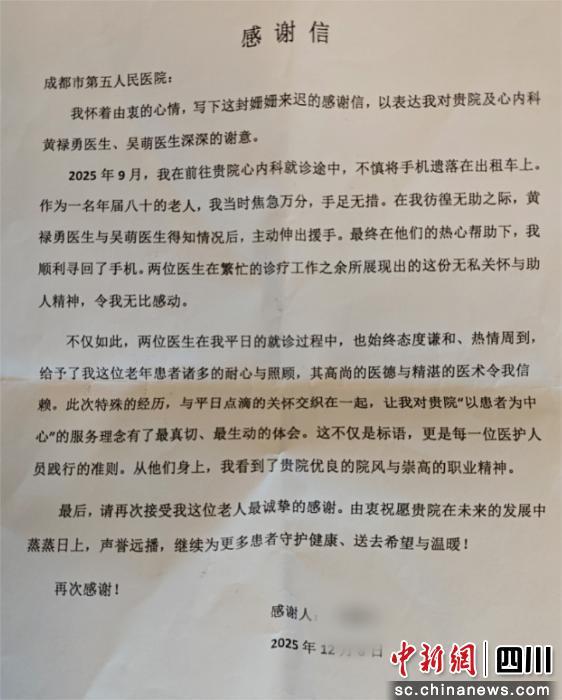 中新网四川新闻12月18日电 近日,成都市第五人民医院心血管内科收到一封来自80岁刘奶奶的感谢信。信中描写了一次就诊途中的意外插曲,让我们看见医护工作者在专业之外,那份自然流露的关怀与担当。