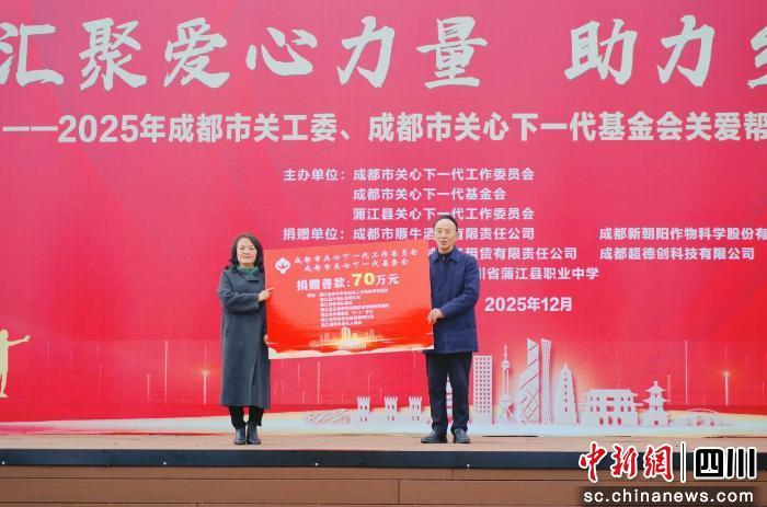 中新网四川新闻12月30日电 12月30日,成都市关工委、成都市关心下一代基金会联合蒲江县关工委,携手成都市顺牛酒业有限责任公司、成都新朝阳作物科学股份有限公司、四川蓝恒机械设备租赁有限责任公司、成都超德创科技有限公司、成郁市浦议食品有限公司等爱心企业,在蒲江县职业中学共同举办“汇聚关爱 力量助力乡村振兴”公益捐赠活动。