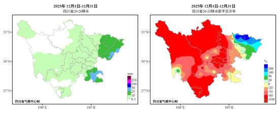气象监测显示,2025年12月全省平均降水量5.7毫米,较常年同期偏少42%,位列历史同期第10少。全省156个国家气象观测站中有39站无降水,主要分布在攀西地区和川西高原。与常年同期相比,盆地东北部和川西高原西南部降水偏多,其余大部偏少。