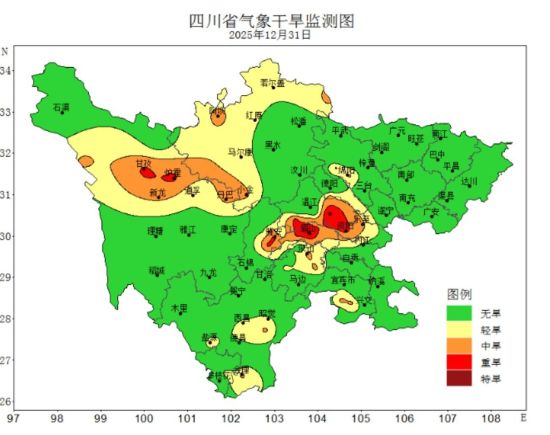 目前,气象干旱主要出现在川西高原中部和盆地西部部分地区,从全省看整体上不明显。据2025年12月31日气象干旱综合指数监测,在全省156个国家气象观测站中,有52站存在气象干旱,其中轻旱17站、中旱23站、重旱10站、特旱2站。重度以上气象干旱主要分布在川西高原中部以及盆地西部成都、雅安和眉山3市,重旱为蒲江、邛崃、简阳、甘孜、炉霍、丹棱、彭山、荥经、雅安、雁江,特旱为东坡、龙泉驿。