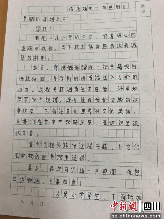 “亲爱的唐嫣女士:收到您捐赠的书籍,就像收到了来自远方的星光,照亮了我们的读书路……”四川甘孜州巴塘县人民小学学生丁真拉姆的一封感谢信,被贴在“唐嫣爱心图书室”的玻璃墙上。在这座被雪山环抱的校园里,图书匮乏曾让孩子们的求知渴望难以安放,而唐嫣的捐赠,为这里带来了涵盖艺术启蒙、科普知识的书籍,也带来了跨越山海的暖意。