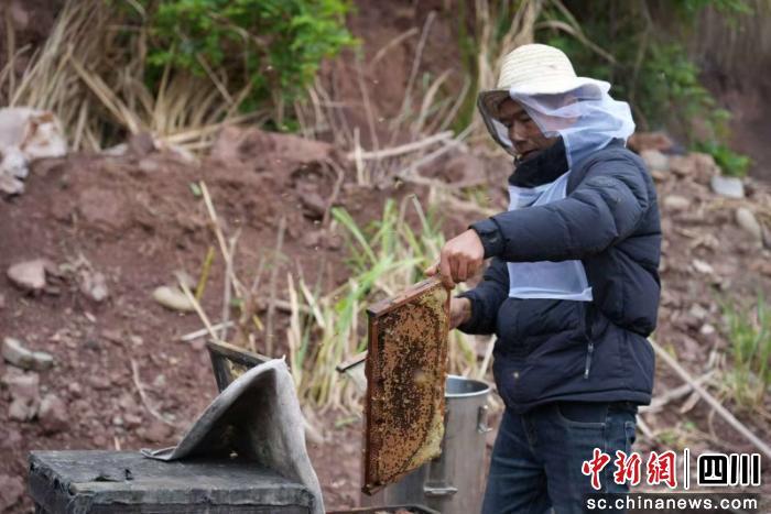 中新网四川新闻3月20日电(吴善 闫凯 袁芳)“哪里花开,我们就去哪里!”这句简单的话,概括了养蜂人陈大哥和妻子杨大姐全部的生活哲学。近日,在资阳市安岳县卧佛镇,陈大哥正忙着为前来取蜜的村民摇蜜。金黄透亮的蜂蜜从蜂巢中缓缓流出,空气中弥漫着沁人的香甜。