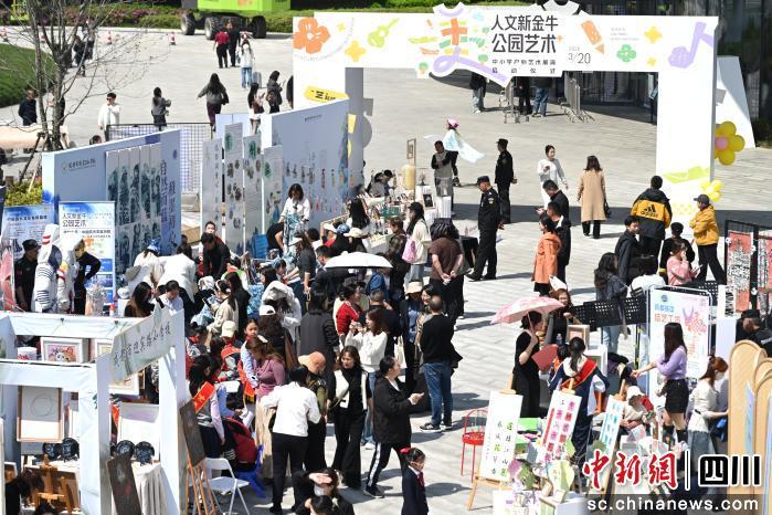 当教育走出校园,与城市对话,会碰撞出怎样的火花?在天府艺术公园湖滨广场,非遗工坊与书画创作比邻而立,科创体验与传统体育相映成趣,“小匠人市集”的吆喝声与清音婉转的唱腔交织——这里不再是单一的活动场地,而成为一座“没有围墙的美育课堂”。