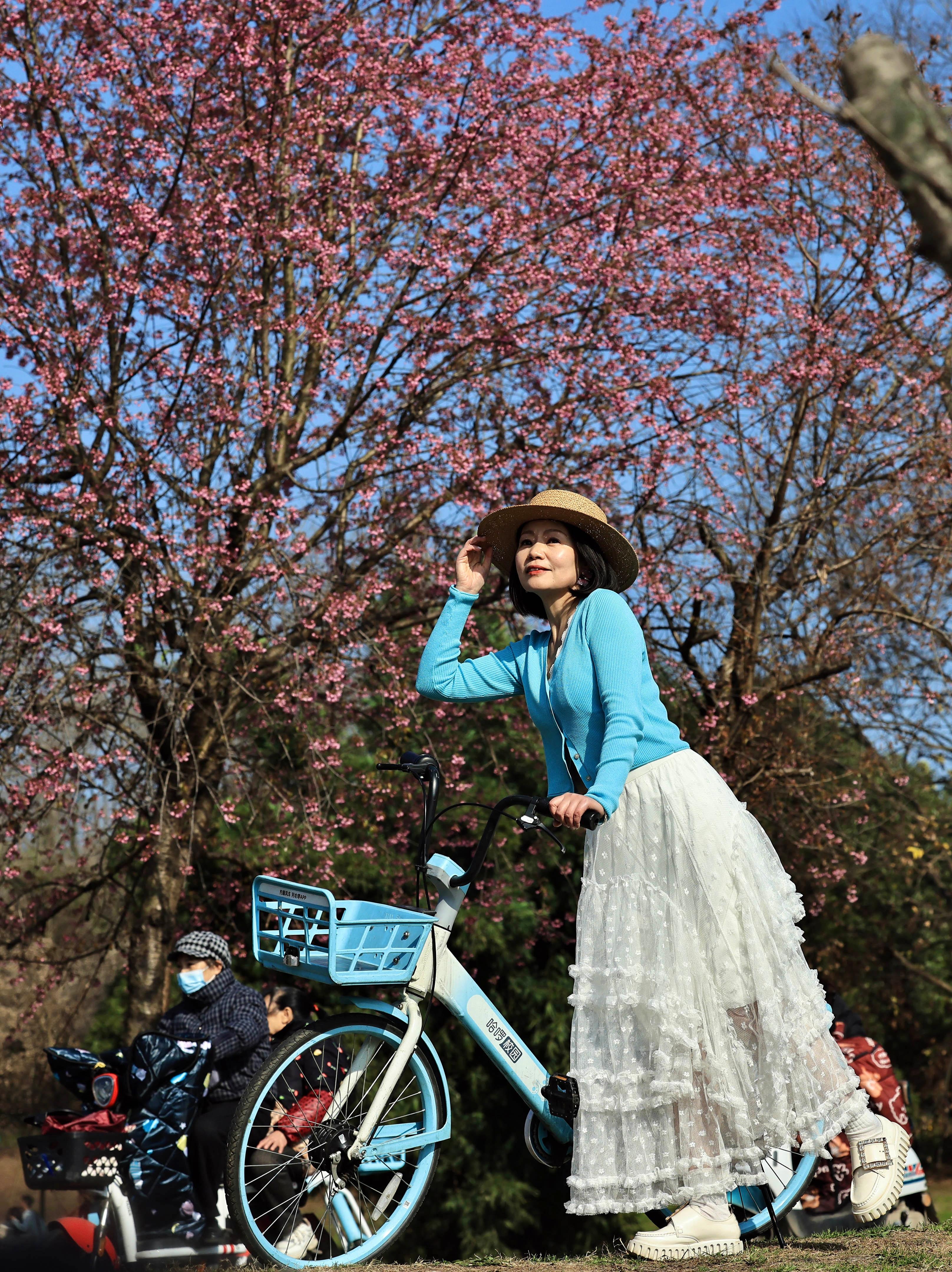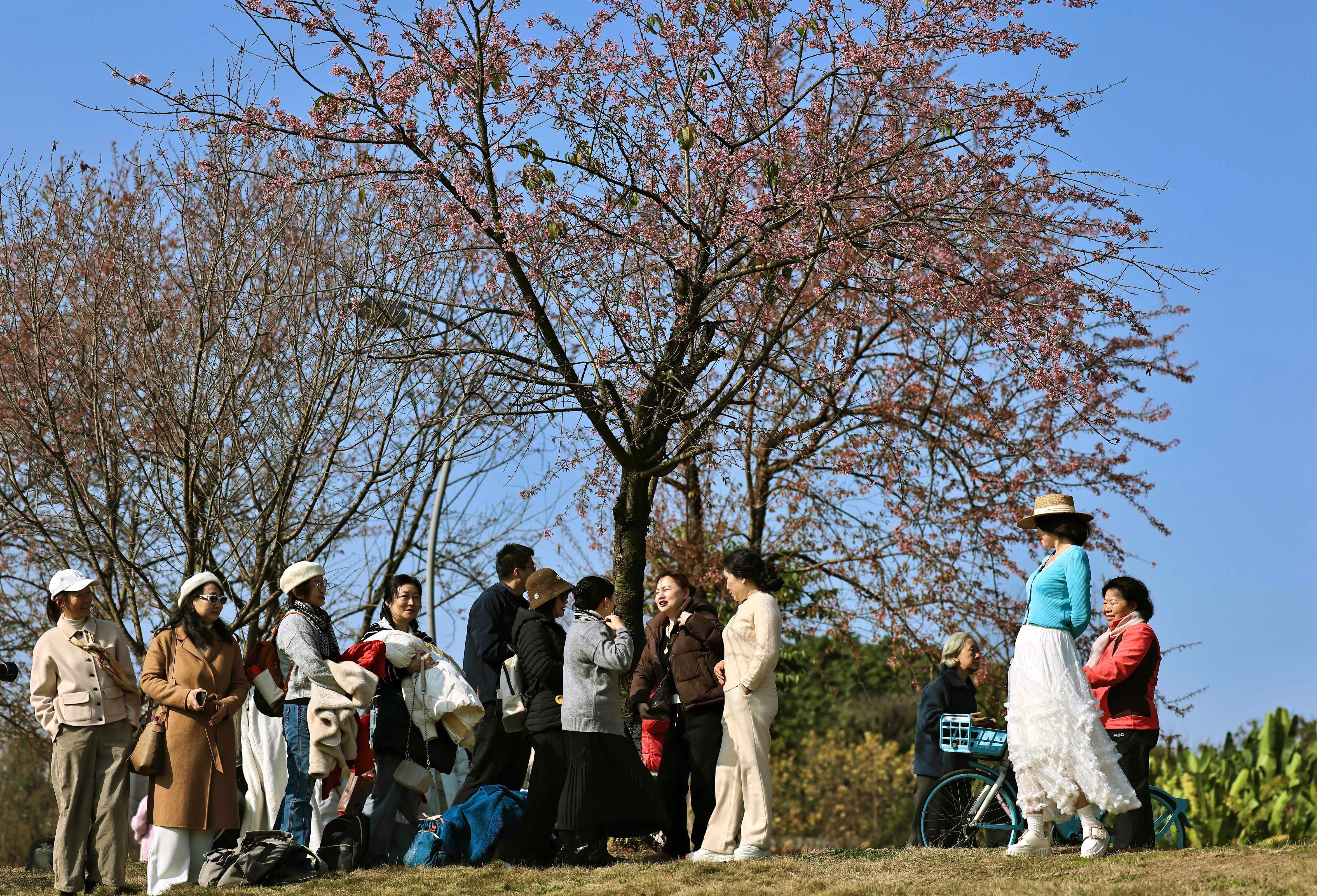 1月6日,成都市青龙湖公园的冬樱花开放,吸引游人前来赏樱花、享暖阳。图为市民在樱花树下享受暖阳。中新社记者 王磊 摄