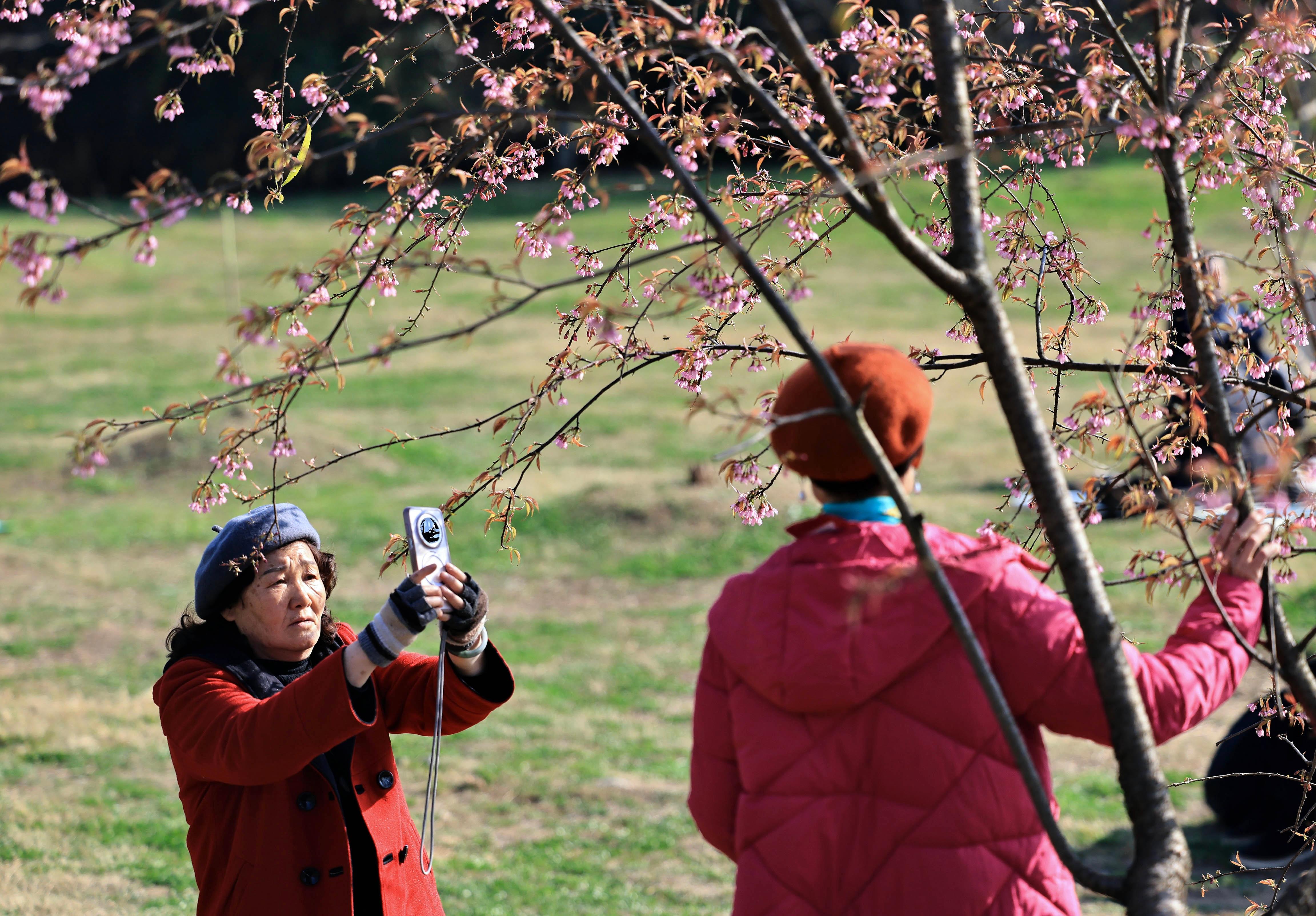 1月6日,成都市青龙湖公园的冬樱花开放,吸引游人前来赏樱花、享暖阳。图为市民在樱花树下拍照。中新社记者 王磊 摄
