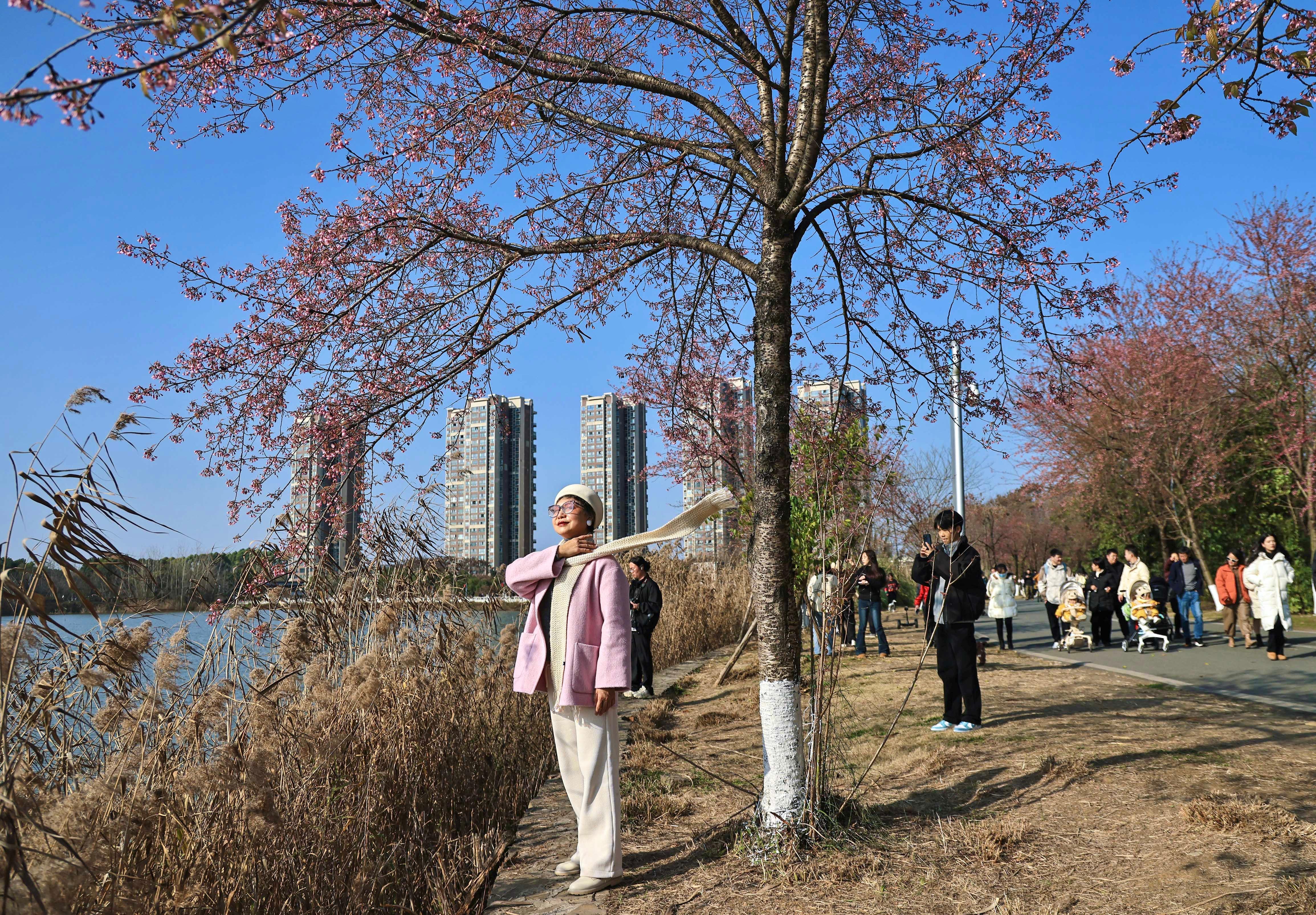 1月6日,成都市青龙湖公园的冬樱花开放,吸引游人前来赏樱花、享暖阳。图为市民在樱花树下摆姿拍照。中新社记者 王磊 摄