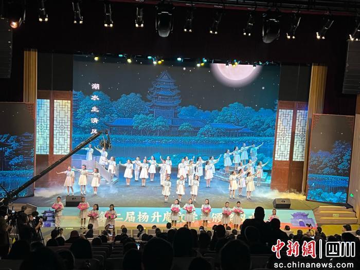 不同于传统颁奖仪式,本次颁奖以四幕舞台剧串联起杨升庵的人生轨迹与精神脉络,成为全场亮点。从《少年风华》开篇中24岁高中状元、胸怀天下的青年才俊到《苦乐相随》篇章里被贬云南、与夫人黄峨依依惜别的深情志士,再到《蜀云滇月》中在边陲编书绘图、促进民族融合的文人典范,最后以《梦归新都》中70余岁仍心念故土的老者形象落幕,演员们用细腻的演绎,将杨升庵“临利不敢先人,见义不敢后身”的人格操守与“文以载道,情以寄乡”的文化情怀展现得淋漓尽致。此外,新都区繁江小学学生带来的川剧戏歌《桂湖寄思》,以童声演绎杨升庵诗词,让传统文化在年轻一代中焕发新生。