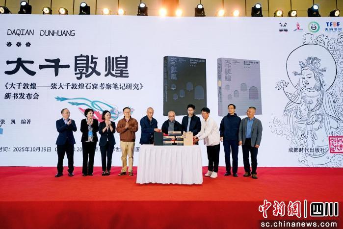 中新网四川新闻10月19日电 (杨予頔)10月19日,在天府书展现场,由四川博物院副研究馆员张凯编著、成都传媒集团旗下成都时代出版社出版的新作《大千敦煌——张大千敦煌石窟考察笔记研究》正式发布。200余幅高清影像,70万字编著内容,首次全景式公布了张大千1941年敦煌考察的原始笔记手稿,为敦煌学研究揭开了尘封的历史帷幕,带来了宝贵的第一手资料。