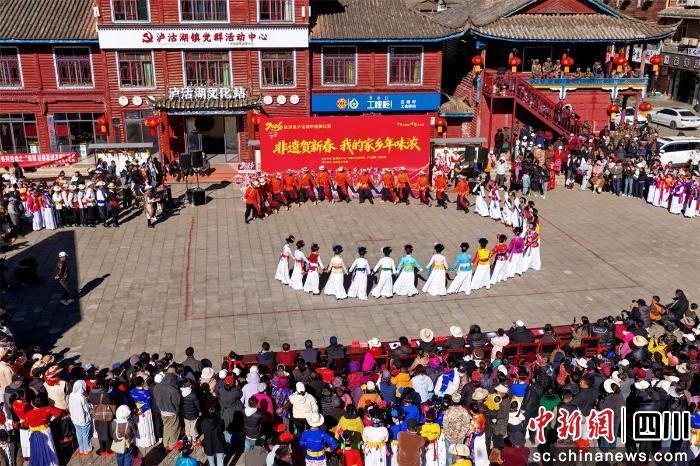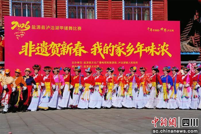 中新网四川新闻2月13日电 近日,凉山州盐源县泸沽湖畔的甲搓舞比赛火热开赛。九支来自泸沽湖片区的队伍身着特色服饰,伴随着悠扬的曲调,以粗犷又灵动的舞步同台竞技,最终多舍青年队斩获冠军。2月13日,摩梭文化系列讲座也正在火热进行中。