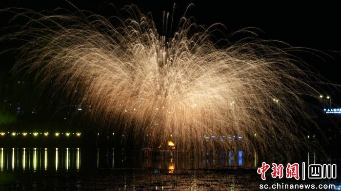 作为夜间盛典的预热高潮,非遗打铁花表演在临水区域震撼上演。高温铁水被击打至空中,瞬间迸发出万颗流星般的璀璨火花,呈现出“火树银花不夜天”的壮丽景象;与此同时,无人机群同步升空,以夜空为幕布,拼出各类图案,与旌湖湖面倒影交相辉映,现场观众纷纷举起手机记录这一震撼瞬间。