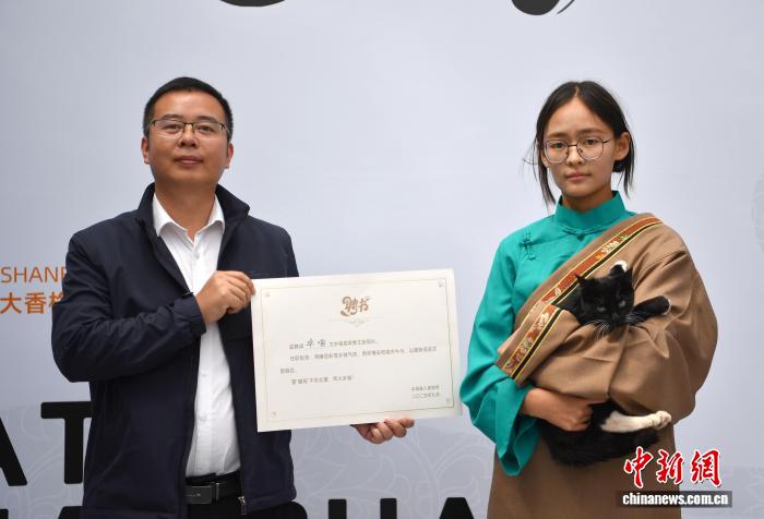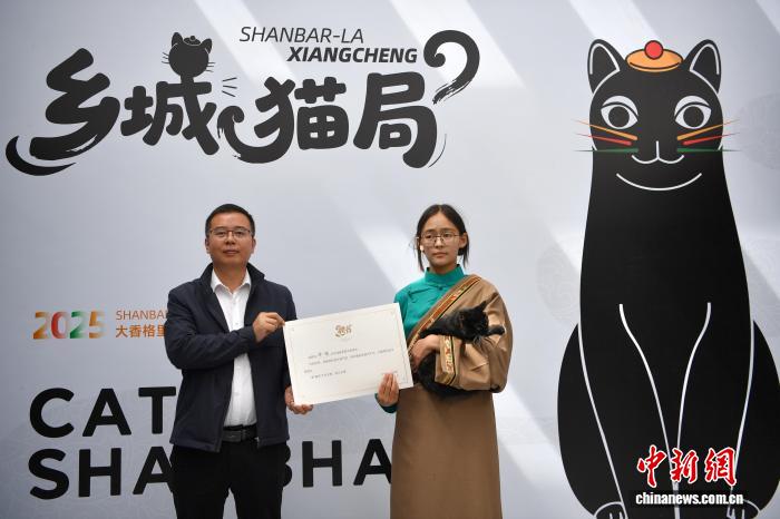 9月20日,嘉宾为“乡城猫局”颁发荣誉文旅局局长聘书。在四川省甘孜藏族自治州乡城县举办的2025大香格里拉环线·乡城白色灌礼文化周期间,本土猫咪“卓喵”在“乡城猫局”聘任发布会上,正式被聘任为“乡城县荣誉文旅局长”。