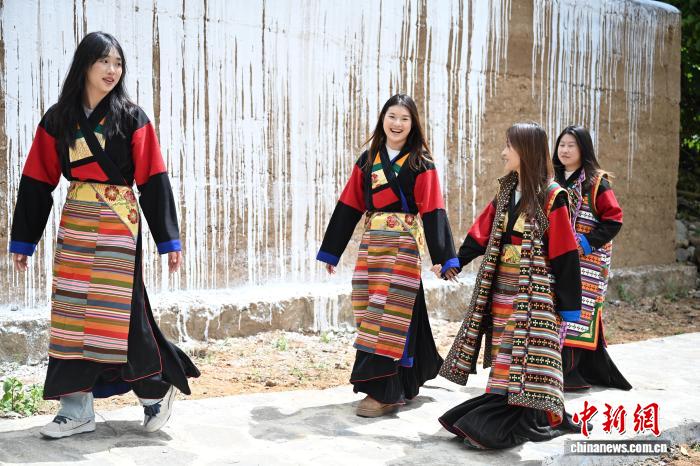 9月21日,四川省甘孜州乡城县青德镇,一些游客穿上藏族女性特有的传统礼服“疯装”,在白藏房前体验“白色灌礼”习俗,感受川西小城乡城县独有的文化魅力