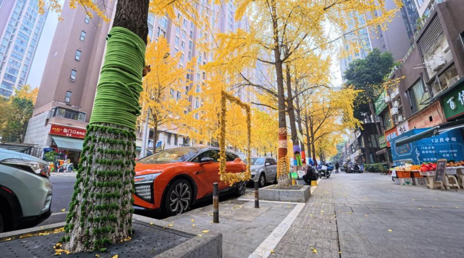 成都:银杏“穿”彩衣 暖心编织点亮街头