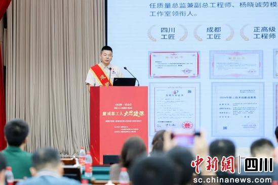 来自中国水电五局的四川工匠、成都工匠杨晓诚,用“攻坚克难,必有收获”总结自己27年来的基层一线工作,深情讲述从一名基层开挖队技术员开始,在岗位上攻坚克难,完成了紫坪铺水利枢纽工程建设、锦屏二级水电站“西电东送”等多个国家级工程。他成立的创新工作室为行业先后培养了20多名高技能人才,持续为中国电建技术和成都城市高质量发展作出贡献。