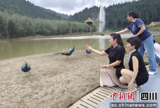 秋日下午,海子山孔雀园内,游客们跟随舞蹈演员跳起充满民族风情的舞蹈,与一旁数只色彩斑斓的孔雀相映成趣;漫步森林栈道,清新的空气令人沉醉;乘坐观光小火车,穿行于原始林海间感受自然之美。