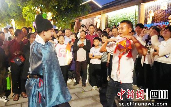 在江安西街绣楼,伴随着一阵喜庆的锣鼓声,“员外老爷”身着传统服饰登台,一番诙谐的开场白瞬间将观众拉入了古代招亲的情境之中。当“员外家的小姐”手持大红绣球,盈盈走上绣楼时,现场气氛瞬间被点燃,欢呼声、喝彩声此起彼伏。