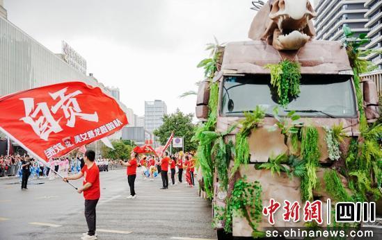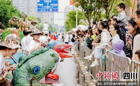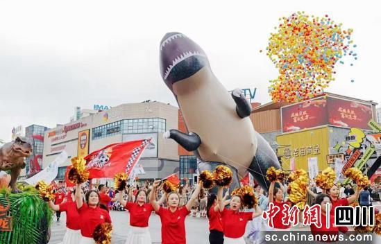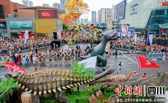 据悉,本次活动的6大主题方阵包括恐龙方阵、美食方阵、汉服方阵及四川省城市足球联赛的球迷方阵等。6大方阵沿着巡游路线缓慢经过,并与观众近距离互动,吸引了数千观众驻足观看。(刘刚/文 自贡市委宣传部 供图)