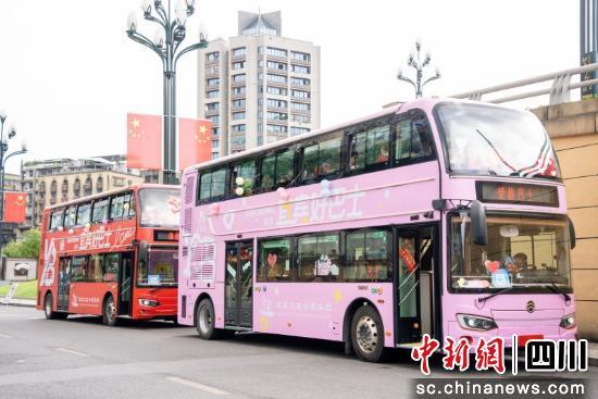 以粉色、红色为主色调的爱情巴士,车身点缀长江波浪纹、爱心与鲜花元素,车内循环播放着经典爱情歌曲,从视觉到听觉都营造出浓郁的甜蜜氛围,沿途站点还为新人准备了520地标打卡、浪漫小提琴演奏、互动小游戏等专属浪漫体验,车厢内外满是欢声笑语。“一进到爱情巴士就觉得特别温馨,像是为我们量身打造的蜜月空间。”新人敖龙笑着说。新人刘江涛更是难掩激动地表示:“今天刚领了结婚证就能参加这么有意义的活动,太幸运了!每一站都有新惊喜,既能欣赏宜宾的美景,又能留下专属我们的回忆,这趟蜜月之旅值了!”