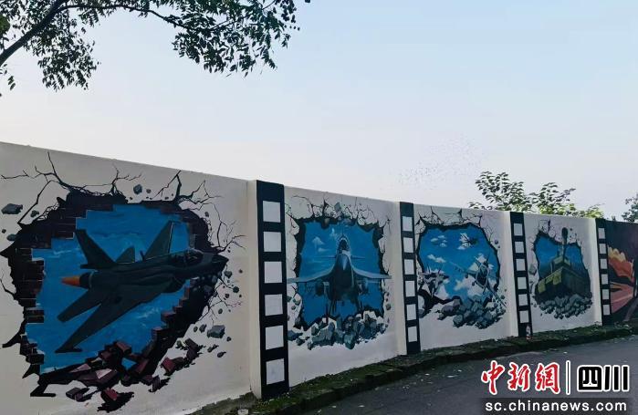 近日,自贡市富顺县城关中学开展了国防教育墙绘活动。当天,由学校师生共同构思、绘制的国防主题墙绘震撼亮相,战机、导弹、航母等国防重器破墙而出……